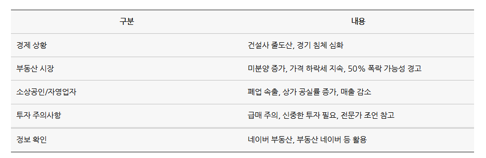표: 부동산 시장 및 경제 상황 요약