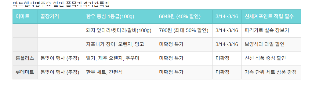| 롯데마트 | 봄맞이 행사 (추정) | 한우 세트, 간편식 | 미확정 특가 | 미확정 | 가족 단위 세트 상품 강점 |